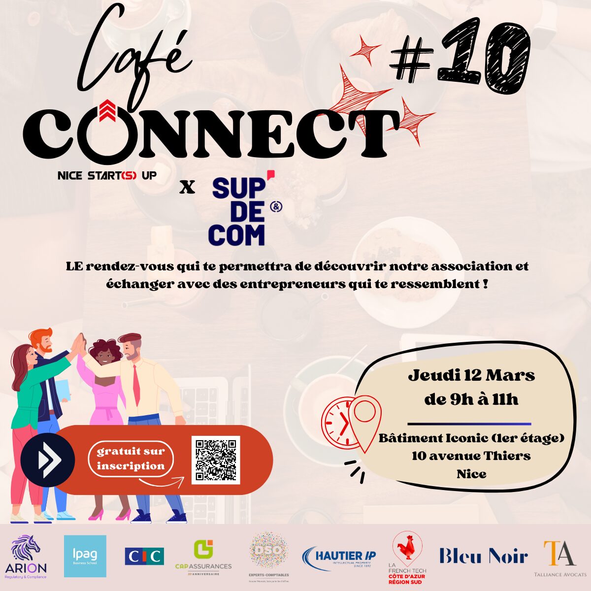 Rendez-vous pour notre Café Connect #10 en partenariat avec Sup de Com' ! Nous sommes ravis de vous retrouver autour d'un petit-déjeuner pour (re)découvrir notre association et échanger avec des entrepreneurs qui vous ressemblent ! ✨ Notre rendez-vous Onboarding des membres qui informe les entrepreneurs voulant se connecter et agrandir leur réseau 👉🏼 Tu viens d’adhérer à notre association ou tu hésites encore, cet évènement est fait pour toi ! ☕ Nous sommes ravis de vous retrouver: 🗓️ Jeudi 12 Mars de 9h à 11h 📍 Sup de Com', 10 avenue Thiers (1er étage - Campus C&D) Nice