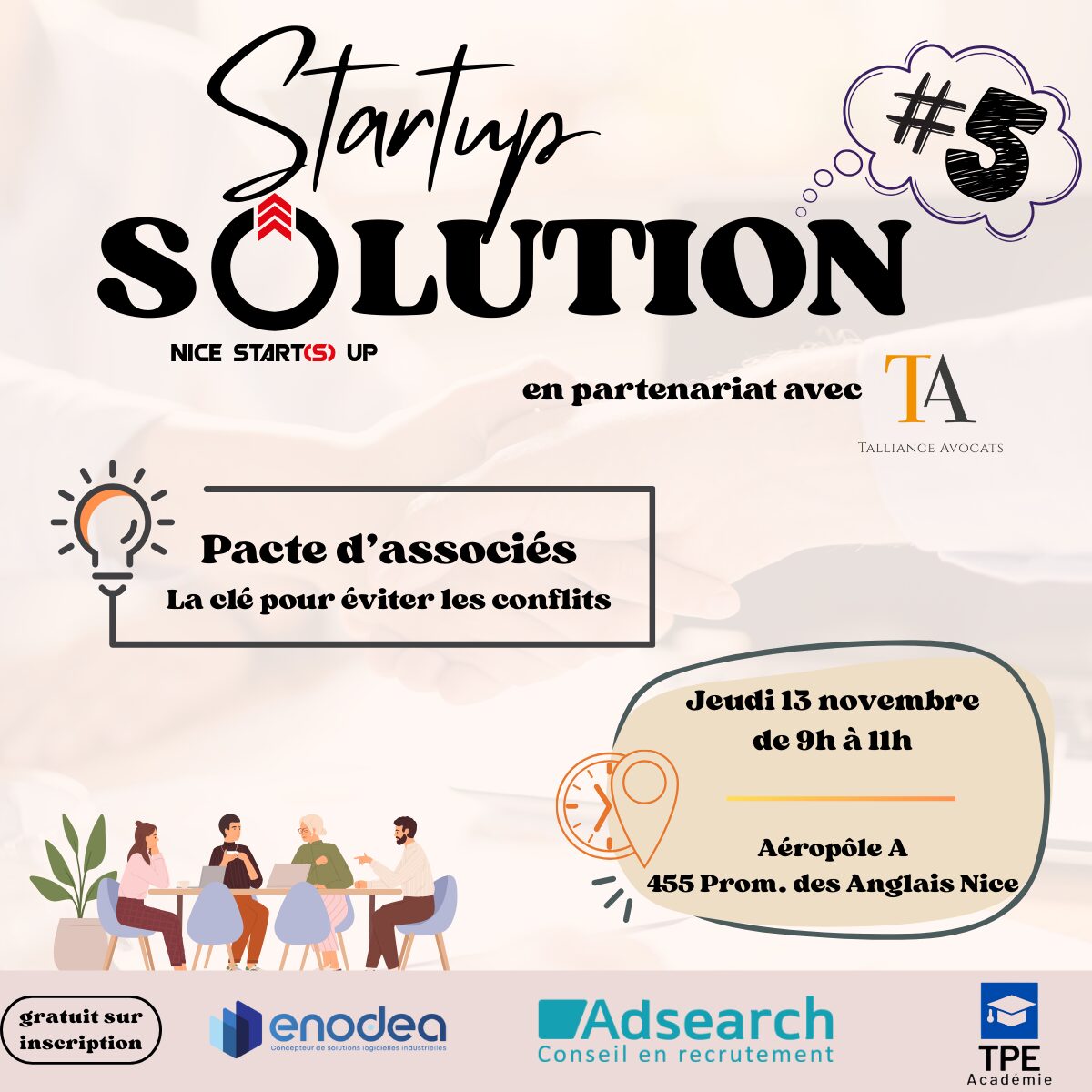 Startup Solution#5 - Pacte d’Associés : La clé pour éviter les conflits 📆 Jeudi 13 Novembre ⌚️de 9h à 11h 📍Adsearch - Aéropôle A, 455 Promenade des Anglais Nice (Accueil des participants à partir de 8h30) 💡 Le concept : Un atelier pratique et interactif pour comprendre les clauses clés d’un bon pacte d’associés et repartir avec une base solide adaptée à votre projet. Infos et inscription